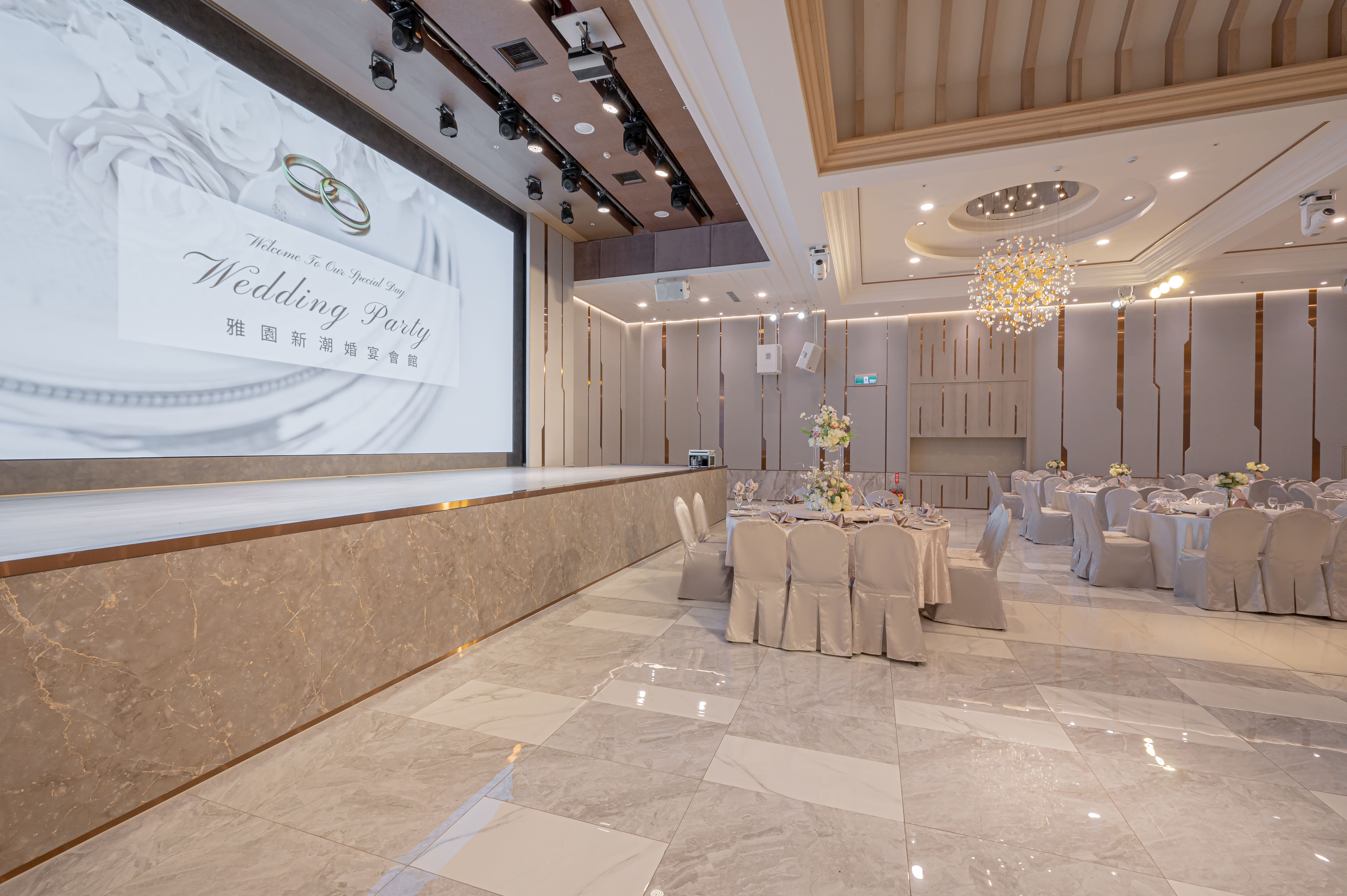 廳內全場無一樑柱的寬廣空間搭配高訂的水晶玻璃吊燈呈現既夢幻又時尚之浪漫氛圍。